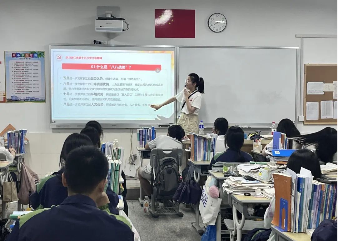 小分队的成员们顶着烈日高温,先后来到宁波市北仑职业高级中学、居民社区等地,通过发放宣传资料、面对面交流、开展志愿服务和理论宣讲等活动,将浙江省第十五次党代会精神及惠民利民政策传达到基层。在宁波市北仑职业高级中学,指导教师徐佳雯为学校师生开展了一次主题宣讲,小分队的学生队员们也纷纷走上讲台,围绕青年人的时代责任,谈使命、谈感悟、讲体会。宁波市北仑职业高级中学的赵慧频老师说:“同学们听完宣讲后感触很深,大家深切体会到小我的发展与党和国家大我发展之间的紧密关系。”学生们都表示要努力成长成才,在奋力推进“两个先行”中贡献个人力量,以实际行动迎接党的二十大胜利召开。