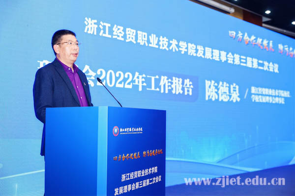 学校校长、发展理事会理事长陈德泉作理事会2022年工作报告,全面回顾了学校2022年度工作亮点,总结了学校发展理事会在“校社政企”四方合作取得的成效。他表示,今后学校将持续深化四方合作机制体制改革,推进多元集团化办学,深耕校企双元协同育人项目,打赢国家“双高计划”建设“攻坚战”,努力实现学校“十四五”发展规划中所提出的建设“中国特色、国内一流、国际知名”高水平职业大学的目标,续写学校发展理事会高质量发展新篇章。